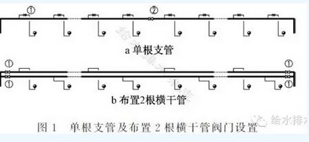橫干管上接出多根豎管時,除在豎管接橫干管的水平短管上設(shè)檢修閥門外,建議當(dāng)橫干管長度大于50 m,在橫干管上合適的位置宜設(shè)置檢修分段閥門,如圖3中②③。
