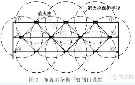 對于單層面積較大的商業(yè)建筑、倉庫及展覽建筑,消火栓數(shù)量較多,如在每個消火栓的DN65支管上設(shè)檢修閥門,閥門數(shù)量太多,給維護(hù)管理帶來不便。這類型建筑,一般建筑體量大,有條件布置多條橫干管,橫干管上錯開布置消火栓,這種情況下可在每根橫干管起始端設(shè)檢修閥門,任何一根橫干管檢修時,可保證相鄰橫干管上的消火栓出水能保護(hù)到受檢修橫管停用而影響的區(qū)域,見圖2中①②③。